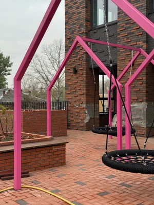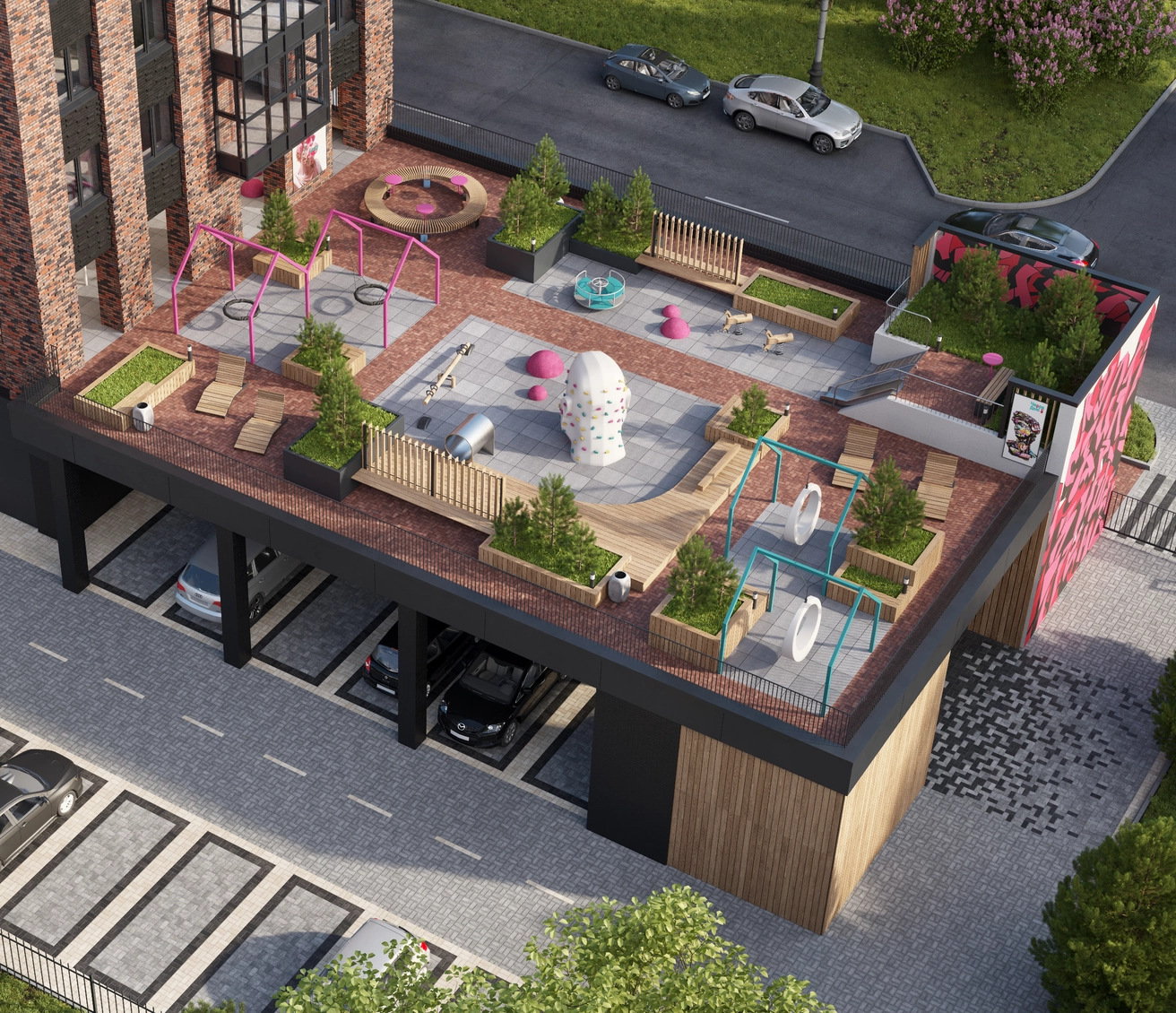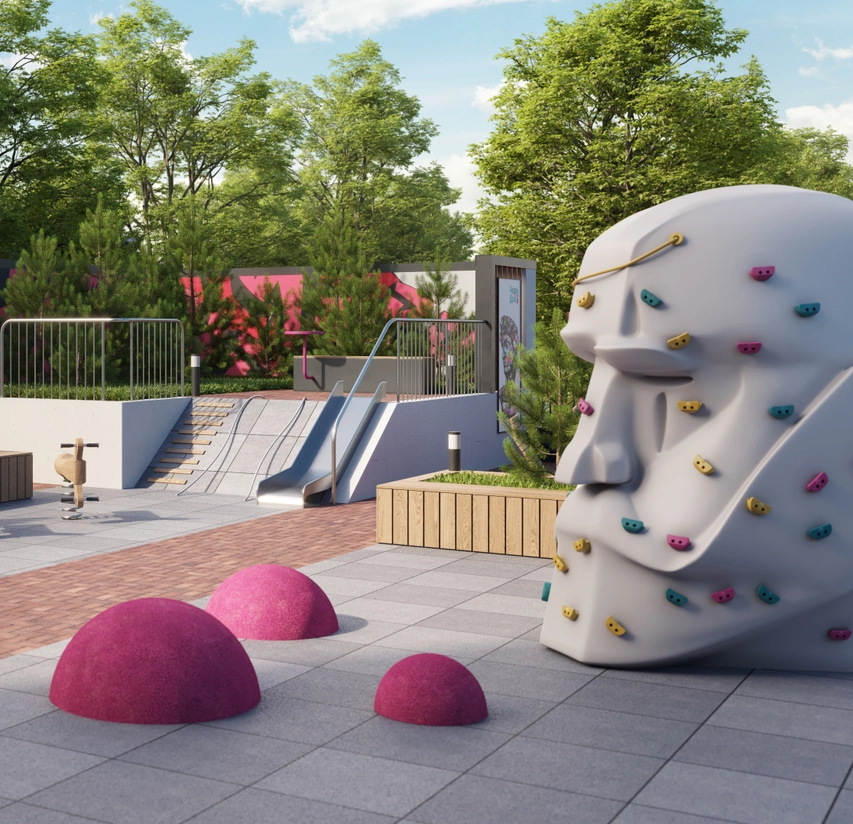 Игровая площадка приподнята на колонны — так мы освободили пространство и добавили света. Есть и крытая часть — на случай дождя. Благоустройство ориентировано на семьи: удобно с детьми, спокойно взрослым.