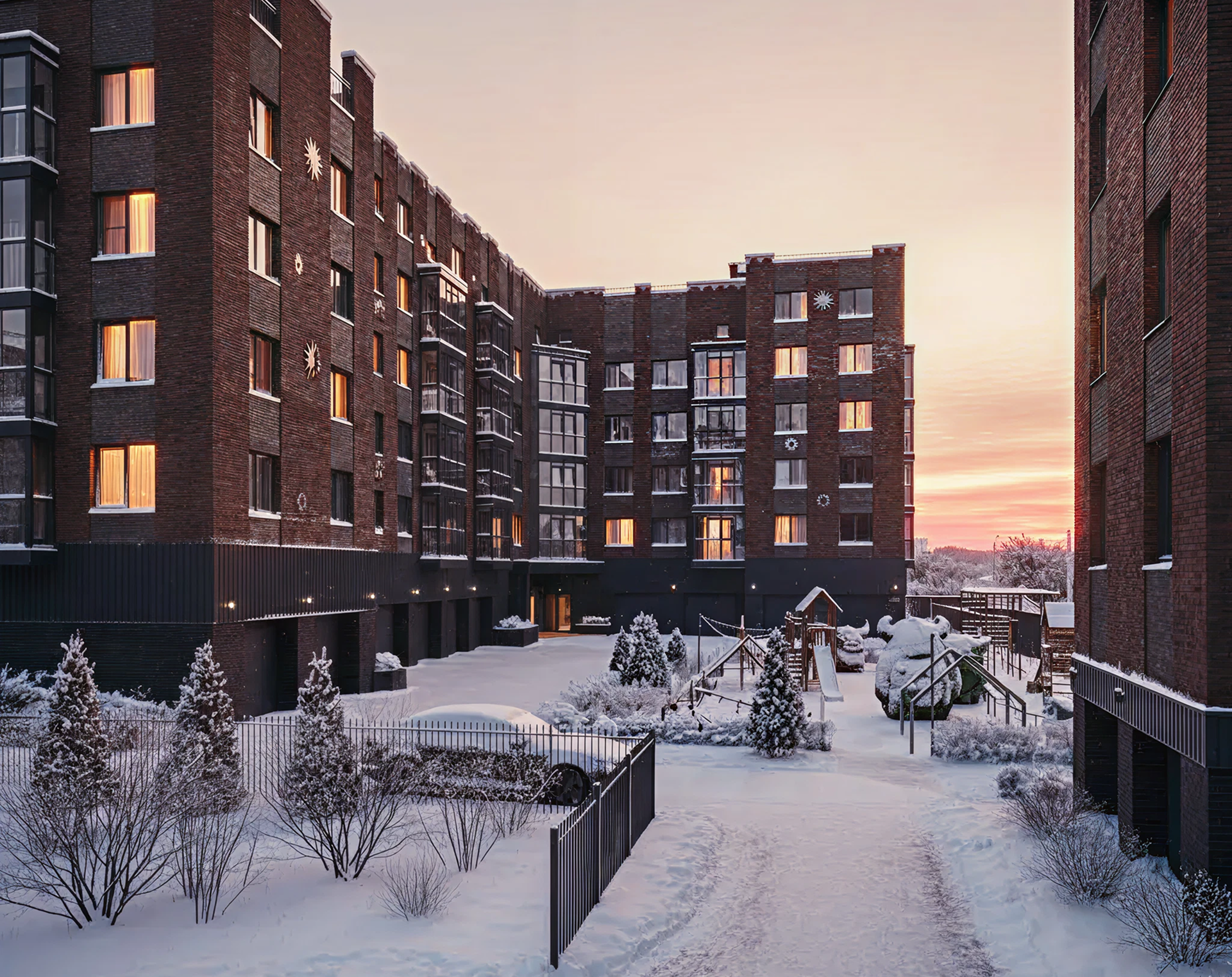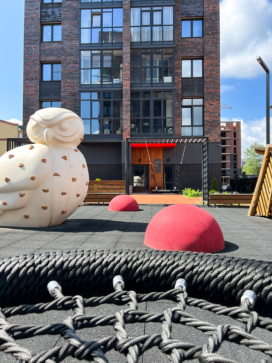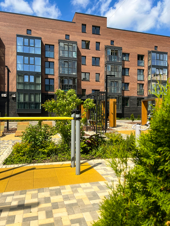 Приватные дворы с дизайнерскими площадками, где дети играют в безопасности.